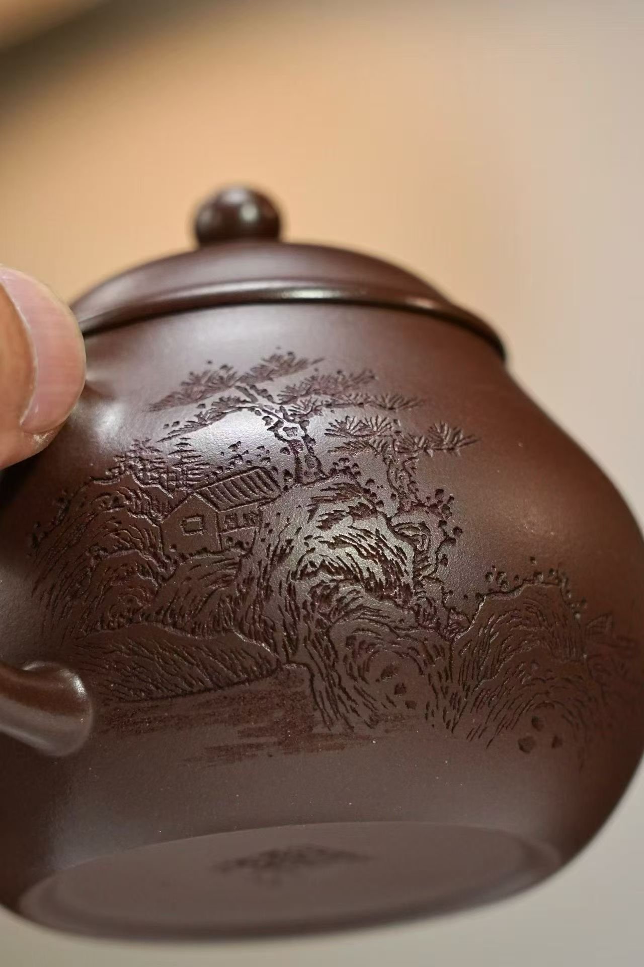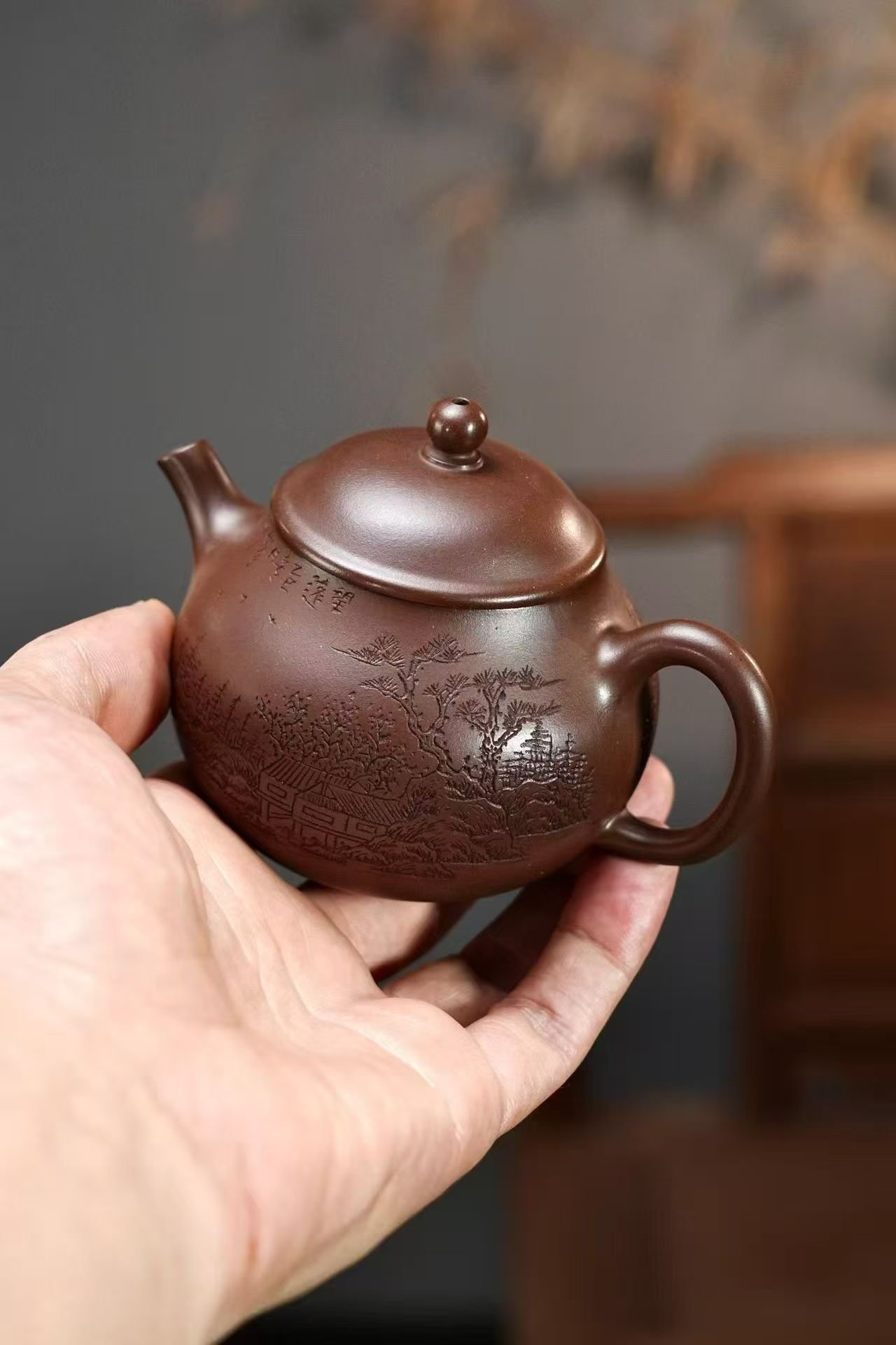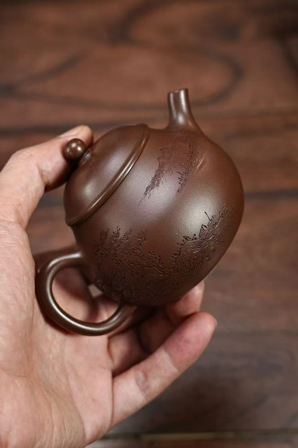 This 150cc pear-shaped Yixing teapot carries a rich vintage clay character, presenting a deep brown body with hand-carved traditional Chinese shan shui (mountain and river) painting motifs. The layered engraving flows naturally around the teapot, showcasing expressive brush-like carving that captures the timeless essence of classical ink landscapes.
