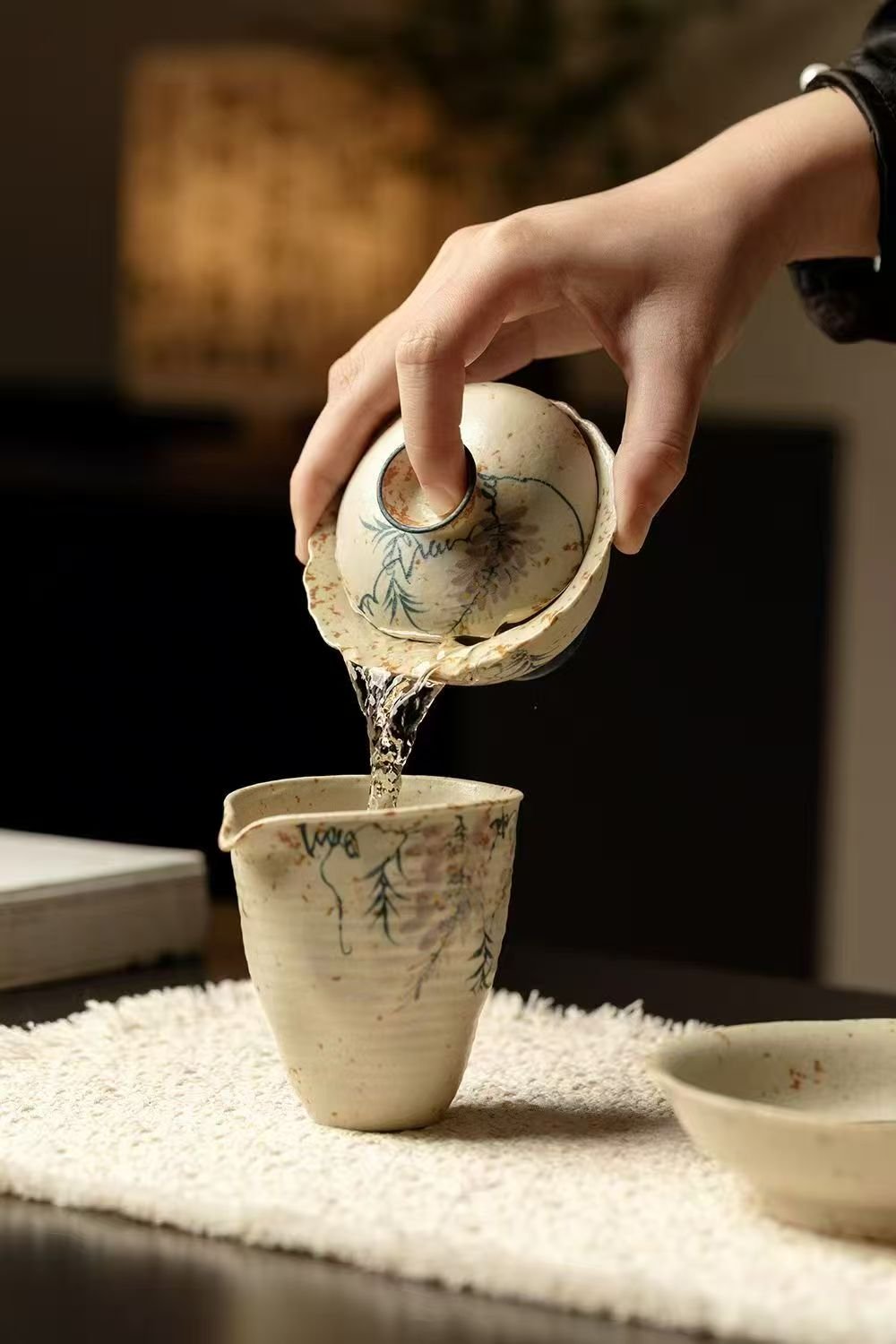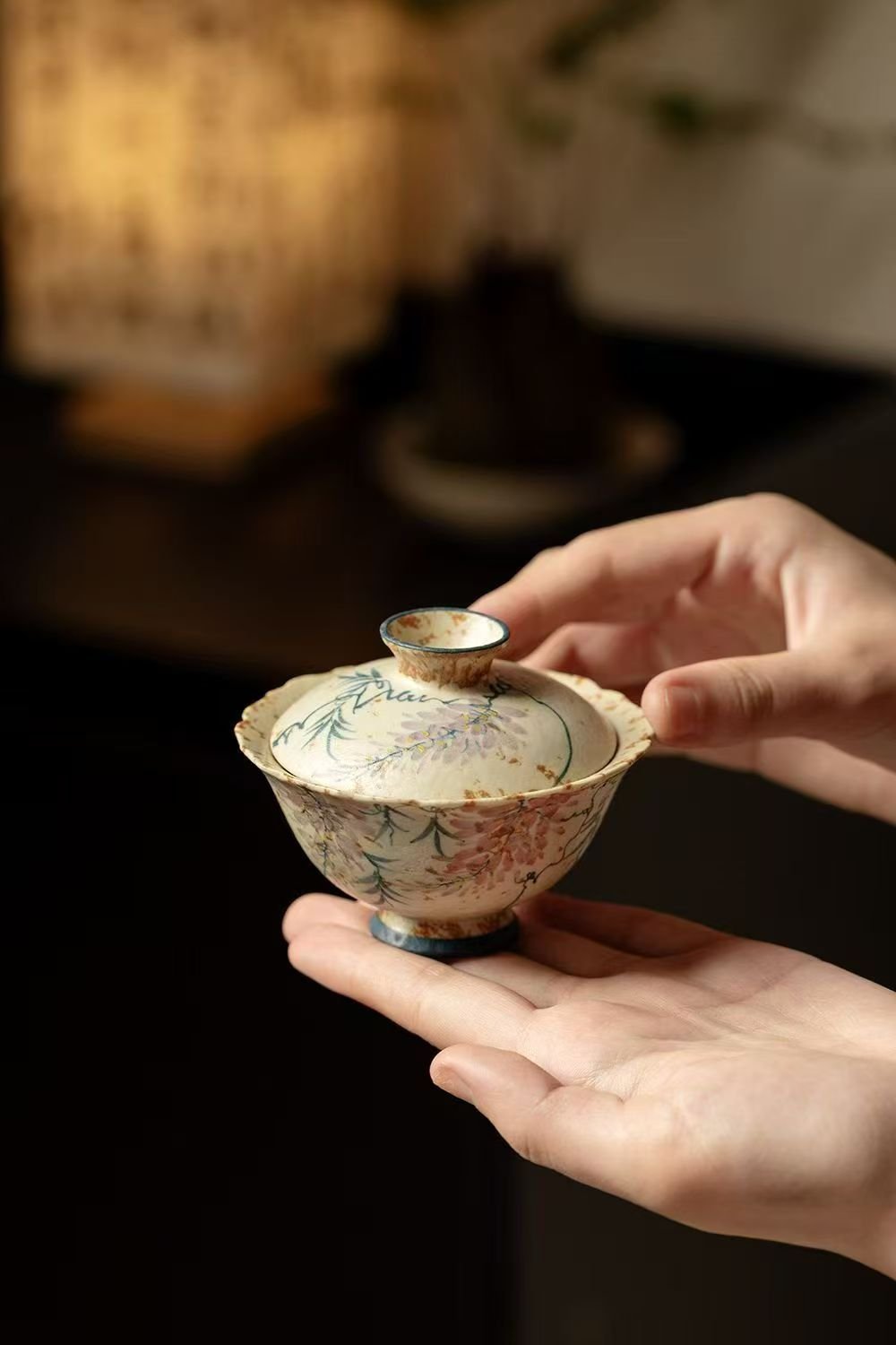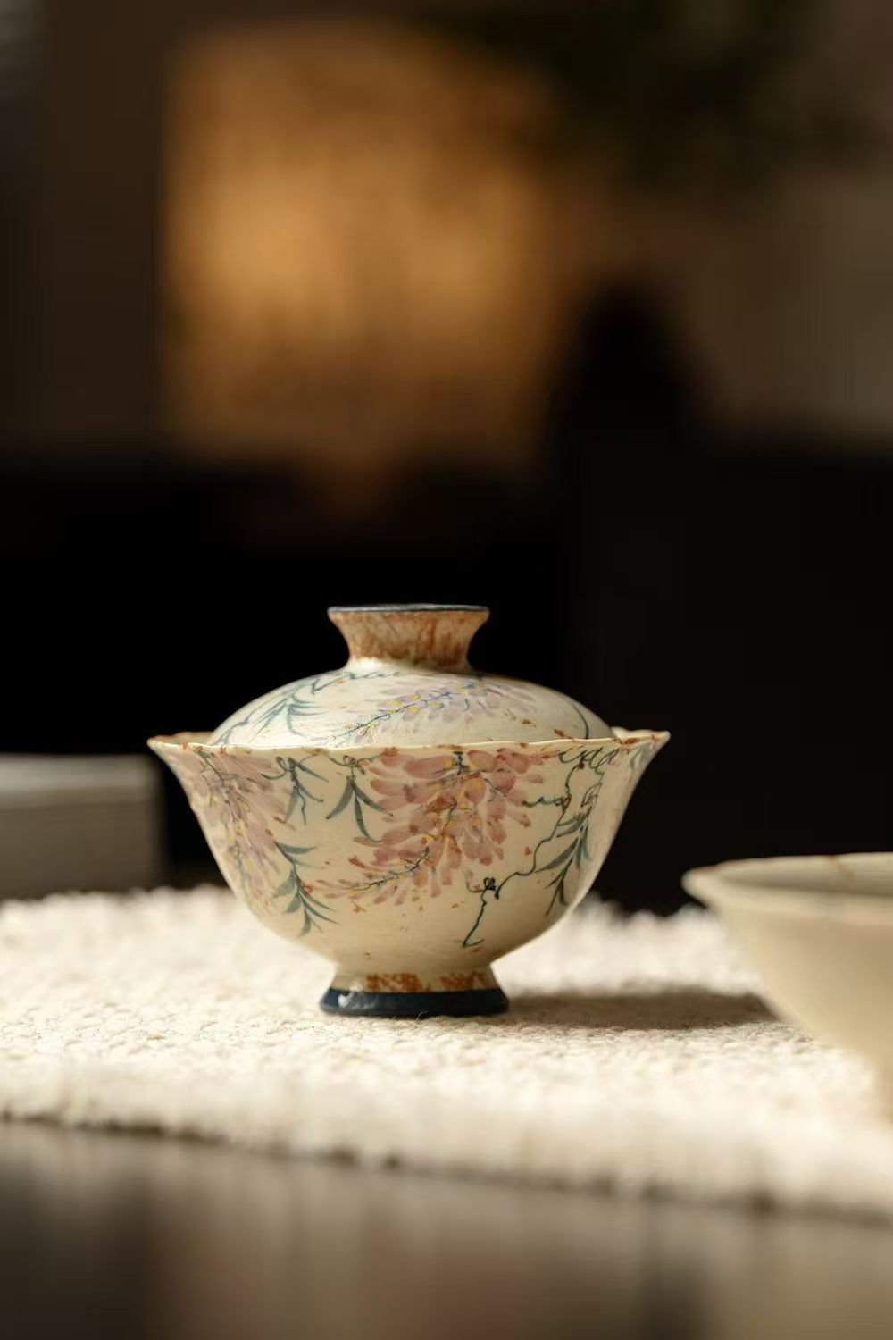 The body is hand-painted with flowing wisteria branches in a relaxed gongbi style, creating a soft contrast between firm ceramic form and gentle botanical movement. Each stroke feels spontaneous yet intentional, like a breeze caught in stillness.