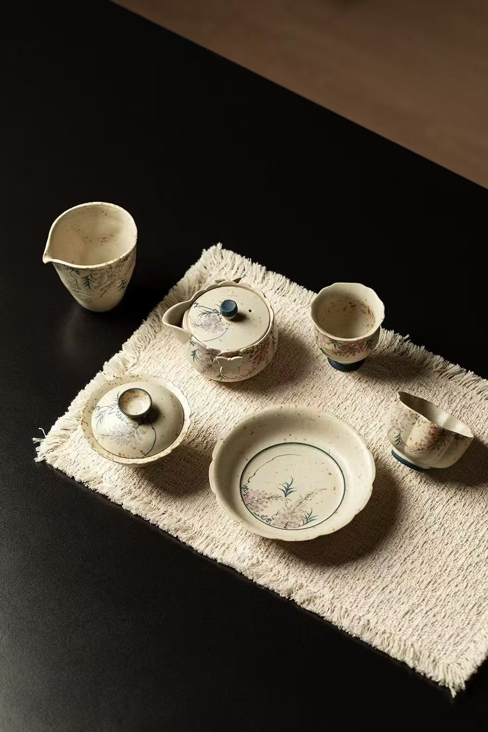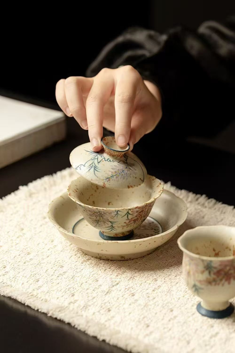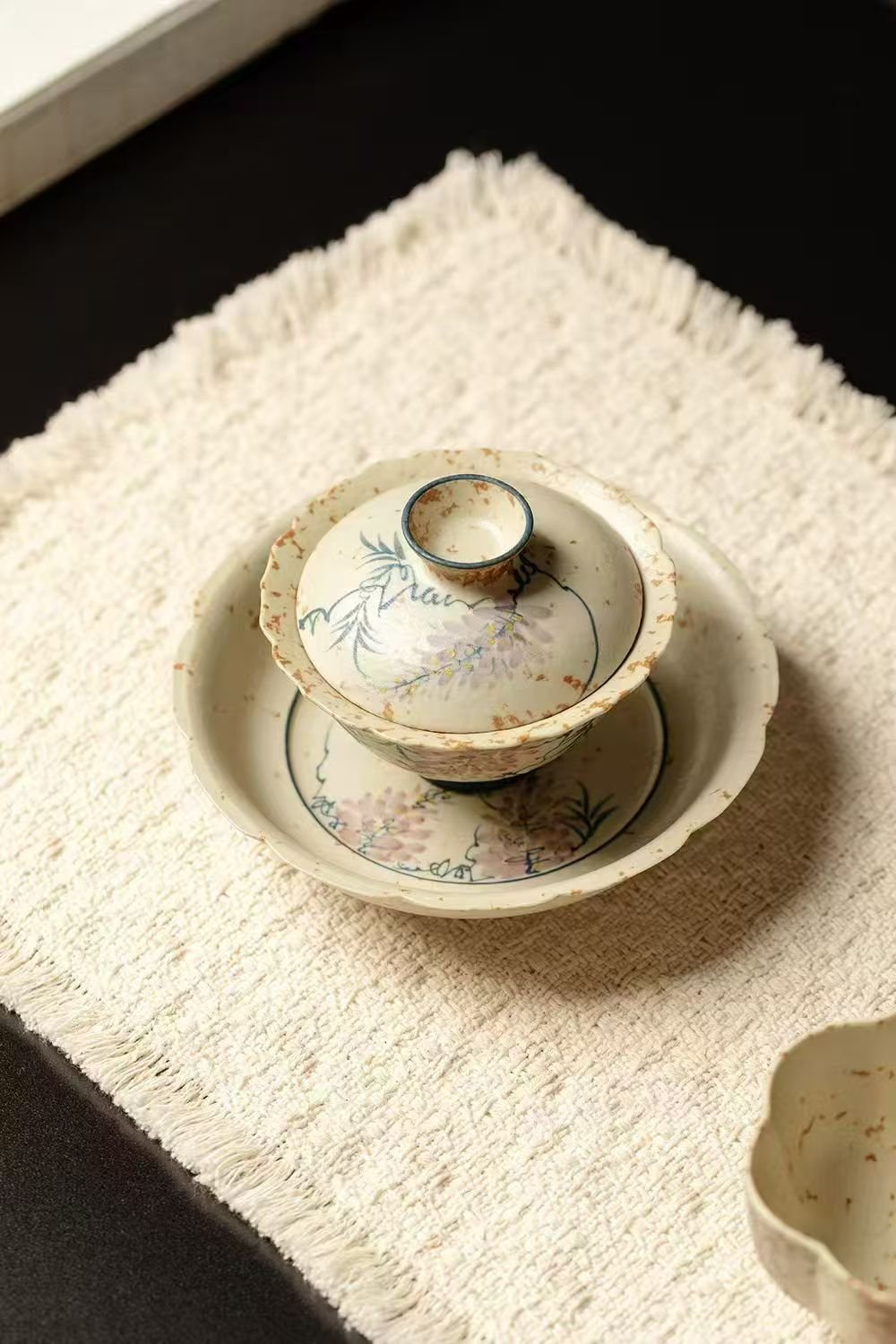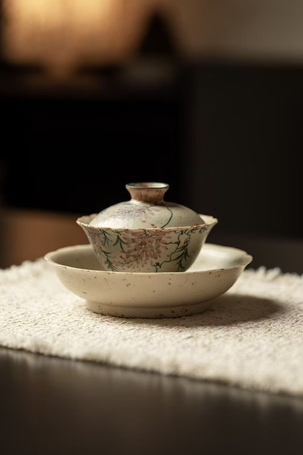 The body is hand-painted with flowing wisteria branches in a relaxed gongbi style, creating a soft contrast between firm ceramic form and gentle botanical movement. Each stroke feels spontaneous yet intentional, like a breeze caught in stillness.